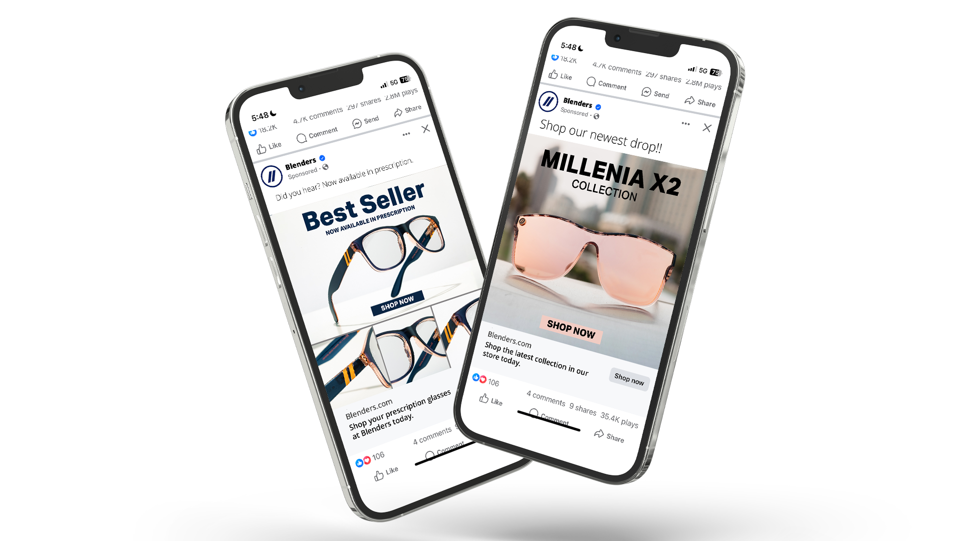 Blenders has hundreds of different eyewear options, and the creative team was frequently tasked with running ads for best-selling products. In creating video templates, we could easily swap out product photos and colors for product consistency, but remain loyal to brand guidelines.